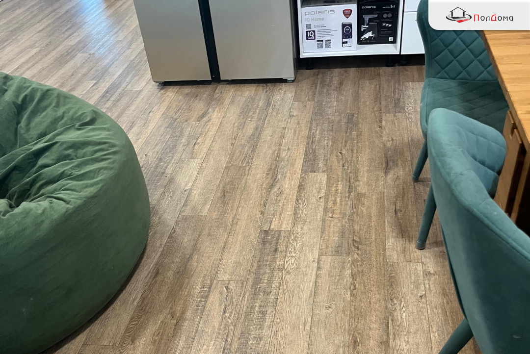 • 100% Водостойкость: покрытие абсолютно не боится воды, что критично для первого этажа и зоны прихожей.