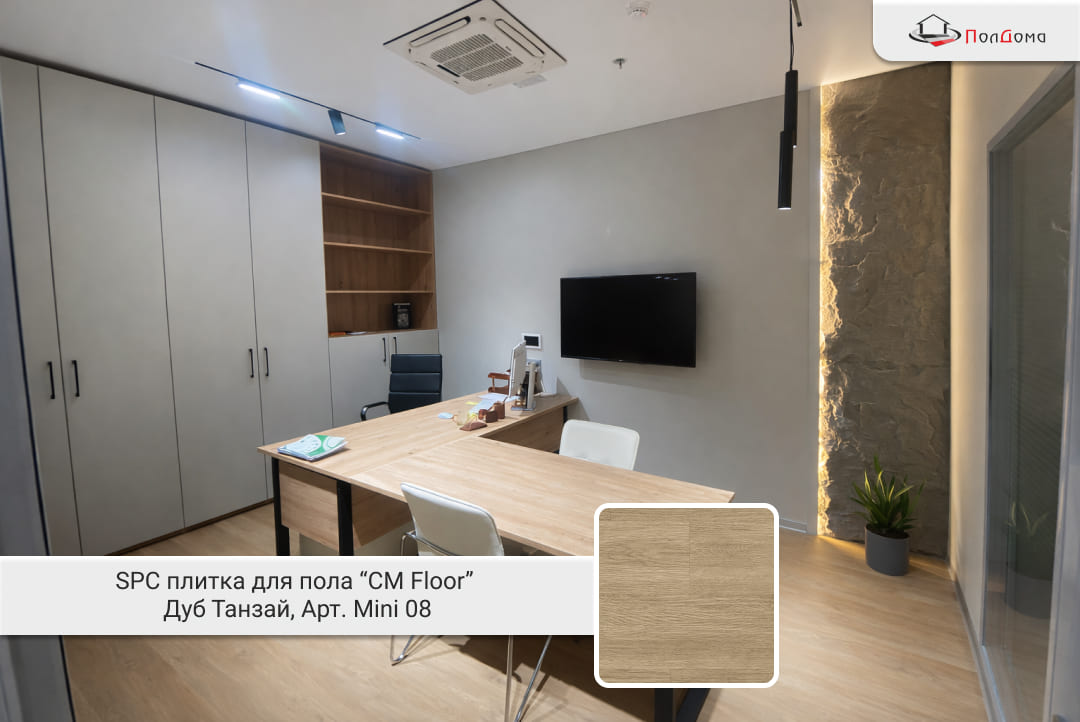 Основа будущего пола — SPC плитка CM Floor Parkett из коллекции Parkett, модель «Дуб Танзай» (арт. Mini 08). Это инновационное покрытие, созданное по технологии Stone Polymer Composite (композит камня и полимеров). Оно сочетает в себе твёрдость натурального камня и гибкость современных материалов. Для офисного пространства такой тандем оказался идеальным: покрытие не боится ни острых каблуков, ни случайно упавших тяжёлых предметов, ни частой влажной уборки.